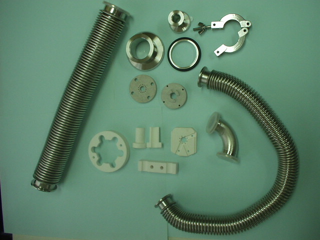 | 写真左右:蛇腹 下中央:碍子関係、かつてアスベスト製だったものを改良。 上右:クイックフランジ。 | 写真右:馬蹄形、被真空機器を乗せる台。カーボン製により傷はつかない、耐熱性あり。 左上:被真空機器(ブラウン管)固定用アームのパッド。 上下:集導子。 | 写真左:Oリング 右:パッキン |